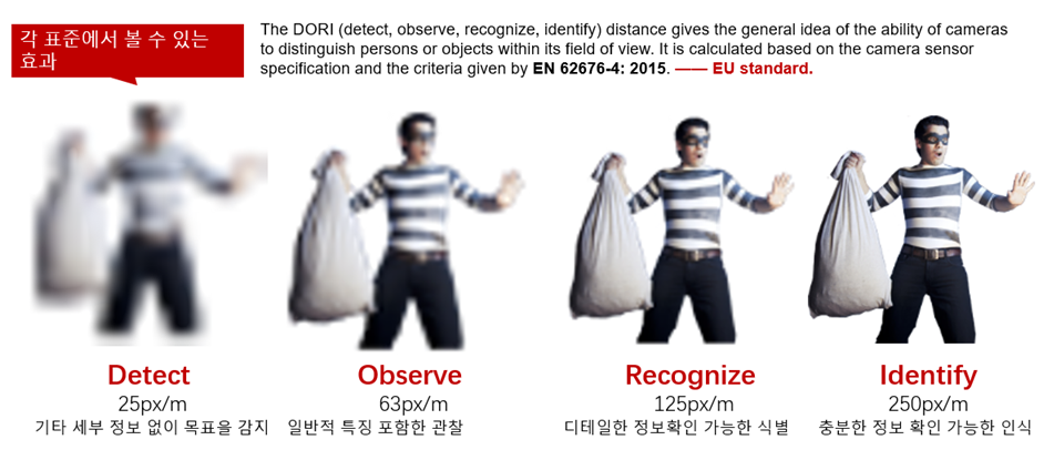 카메라가 '얼마나 멀리 볼 수 있는가'에 대한 객관적인 정의를 위해 도입된 국제 표준(EN 62676-4) 기준입니다.